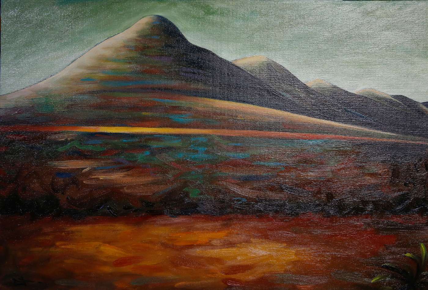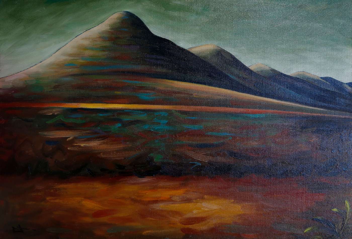 Collines dans le désert. Paysage minimaliste dans une région tellement inspirante non sans rappeler le Nouveau-Mexique de Georgia O’Keeffe. Huile sur carton entoilé, pièce unique.