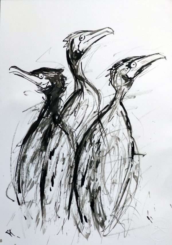 Dessin animalier Encre sur Papier,ย 42 x 29,7 cm, cormorans Camargue
