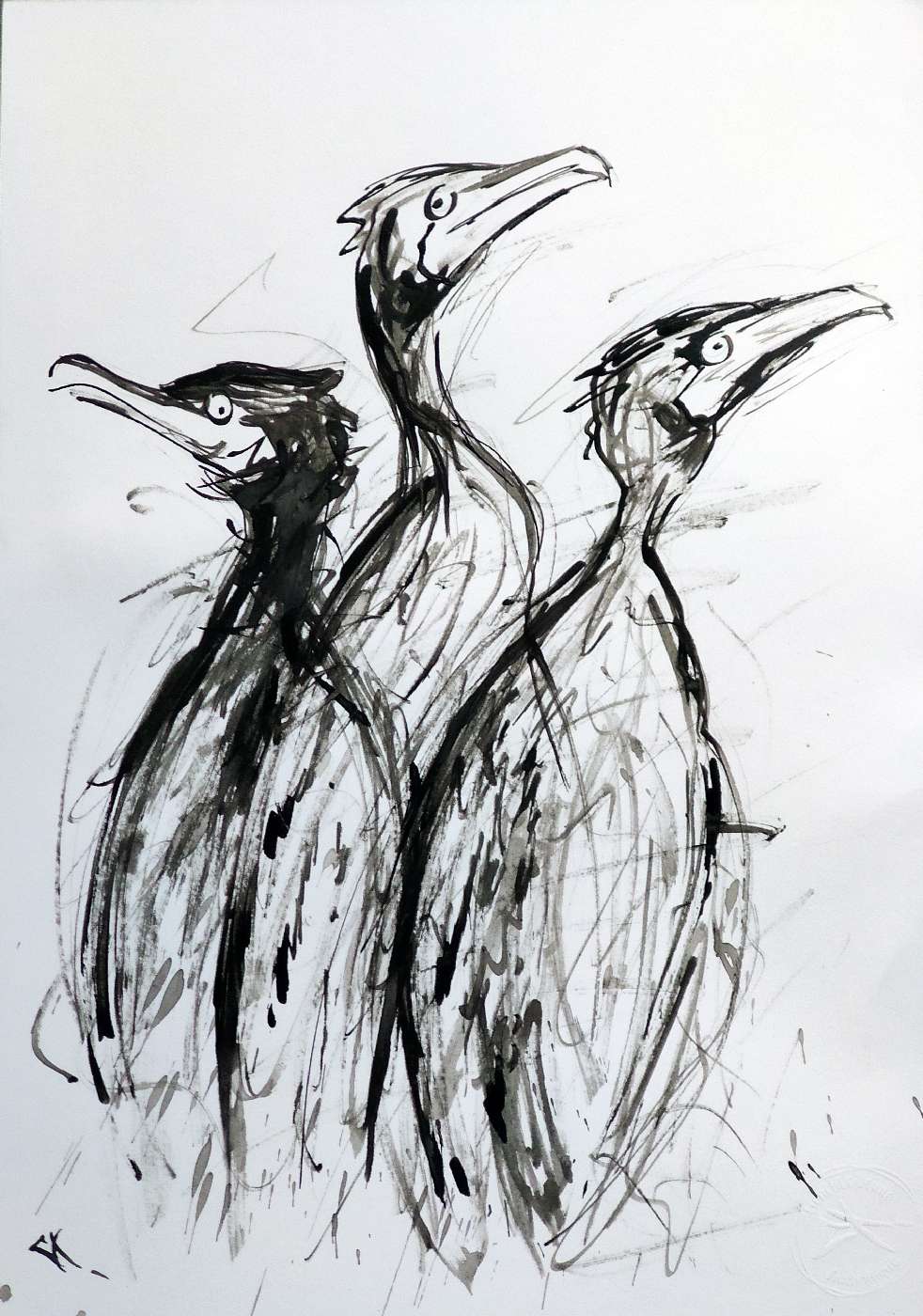 Trois cormorans, dessin en Camargue. Encre de chine sur papier 200 gr. (un petit plis bas de la feuille).