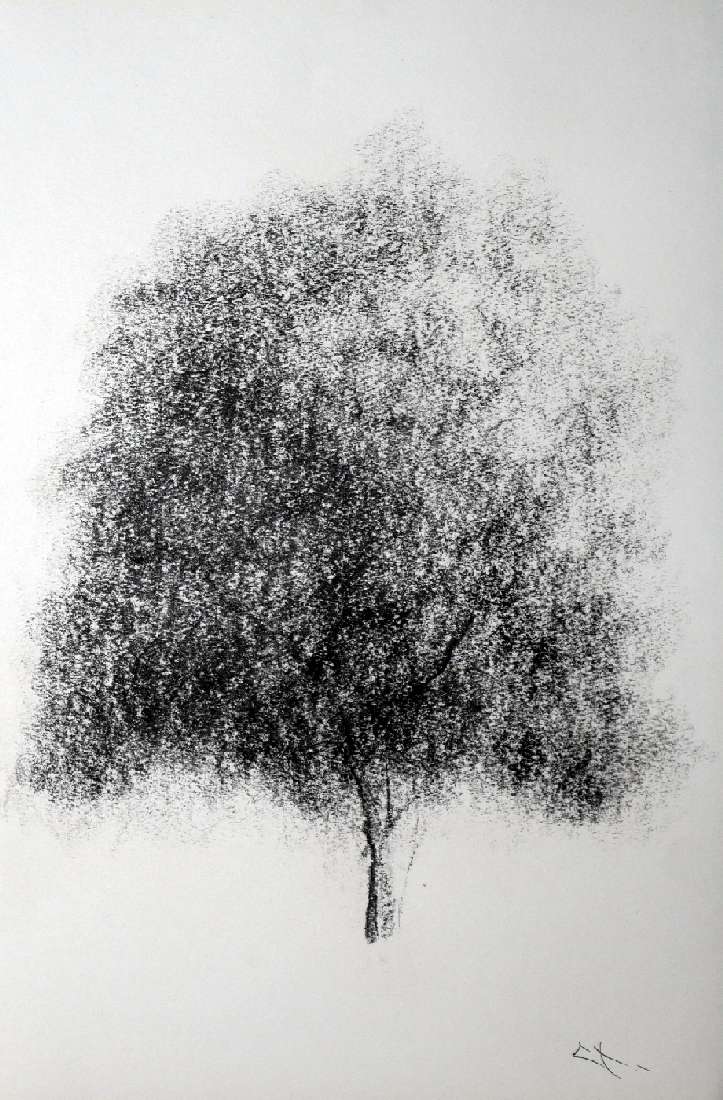 Dessin au fusain qui prรฉsente un rendu extrรชmement texturรฉ et dense. L’artiste a utilisรฉ des variations de pression et de mouvements pour crรฉer une silhouette d’arbre qui semble ร la fois dรฉlicate et imposante. ร premiรจre vue, l’arbre paraรฎt flotter dans un espace indรฉfini et รฉthรฉrรฉ, grรขce ร l’absence de tout arriรจre-plan clairement dรฉfini. Le choix du noir charbon comme teinte principale intensifie le contraste avec le fond blanc pur du papier, offrant un jeu subtil de lumiรจre et d’ombre. La technique utilisรฉe ici, avec des touches rรฉpรฉtitives et fines, donne une structure presque nรฉbuleuse ร l’arbre, suggรฉrant des feuilles ou des branches qui se dรฉplacent lรฉgรจrement au grรฉ du vent. Les troncs fins, sans dรฉtails superflus, se fondent รฉlรฉgamment dans la densitรฉ du feuillage, laissant le spectateur imaginer la suite de l’ลuvre en dehors du cadre. Ce qui rend ce dessin vรฉritablement unique est sa capacitรฉ ร รฉvoquer une forme si reconnaissable dans une abstraction presque totale. Il capture non seulement l’essence visuelle d’un arbre, mais aussi une profonde sensation de tranquillitรฉ et de mystรจre. L’absence de couleur tout en nโutilisant que les diffรฉrentes intensitรฉs du fusain donne une profondeur, et une texture qui attire l’ลil du spectateur ร explorer chaque dรฉtail minutieusement. Ce dessin est un hommage รฉvident ร la beautรฉ et ร la complexitรฉ de la nature, prรฉsentรฉ ร travers une lentille minimaliste et abstraite, dรฉfiant les conventions artistiques traditionnelles tout en conservant une connexion รฉmotionnelle avec son sujet.
