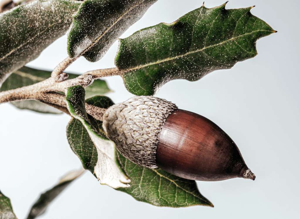 Photographie couleur, 60 x 45 cm . Numérotée et signée. Macro chêne et gland.