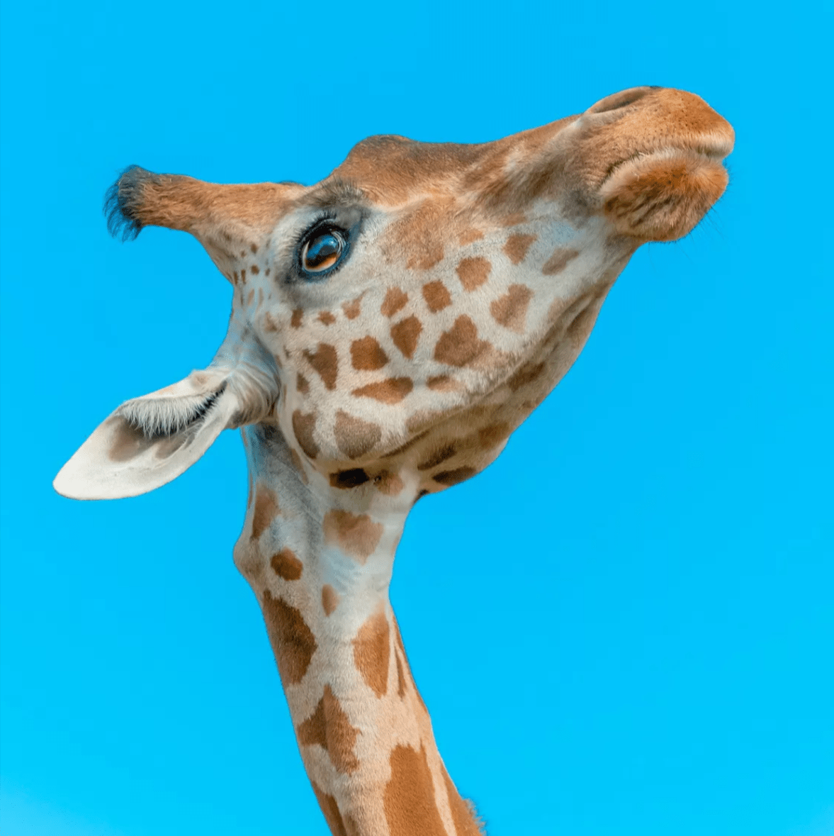 Dans cette œuvre l’artiste capture l’essence majestueuse et sereine du girafon, symbole incontesté des paysages africains. Le cadre est dominé par un fond de ciel azur pur, contrastant magnifiquement avec la robe tachetée et la peau texturée de l’animal. La composition est à la fois simple et éblouissante, focalisée sur la tête élégamment inclinée vers le ciel du girafon, offrant ainsi une perspective inédite. Ce regard , tourné vers le haut, incarne une certaine noblesse et curiosité naturelle. Les détails incroyablement précis de ses yeux, de ses oreilles et de ses narines transportent le spectateur dans une contemplation presque méditative. La lumière naturelle éclaire subtilement les contours de la girafe, accentuant les volumes.. Ce portrait de girafe est plus qu’une simple représentation animale ; il s’agit d’une célébration de la beauté naturelle et de la dignité silencieuse des créatures sauvages. Par son approche unique et la qualité de son exécution, l’œuvre invite le spectateur à admirer, à réfléchir et à se reconnecter à la nature dans toute sa splendeur.