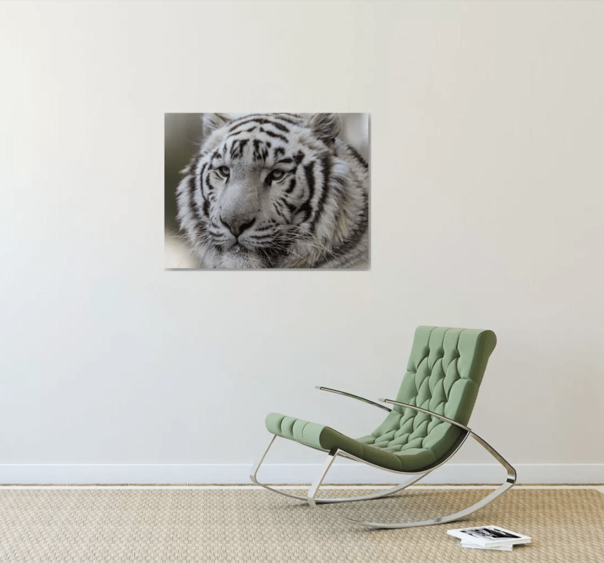 Grande Photographie couleur, 80 x 61 cm . Portrait animalier tigre blanc. Numérotée et signée.