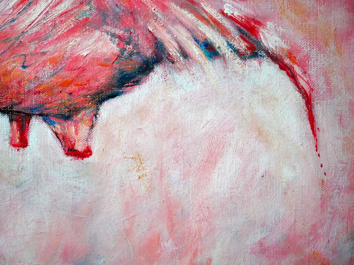 Un flamant rose dans une pose unique comme découpé, se démarque par sa palette de couleurs audacieuses. Le fond vaporeux de l’eau joue avec des nuances de rose, blanc et touches de corail, créant une ambiance de rêve. Le flamant, au centre, est peint avec des coups de pinceau dynamiques et texturés, accentuant la grâce naturelle de l’oiseau en partie immergé. La silhouette élégante contraste avec le fond éthéré, attirant inévitablement le regard et évoquant un sentiment de tranquillité. L’absence de détails superflus met en lumière l’essence de l’animal, en le rendant presque mystique. L’originalité de cette composition réside dans sa capacité à marier abstraction et réalisme, immergeant le spectateur dans une scène où la nature rencontre l’imaginaire. Cette peinture, à la fois simple et complexe, interpelle et invite à la contemplation.