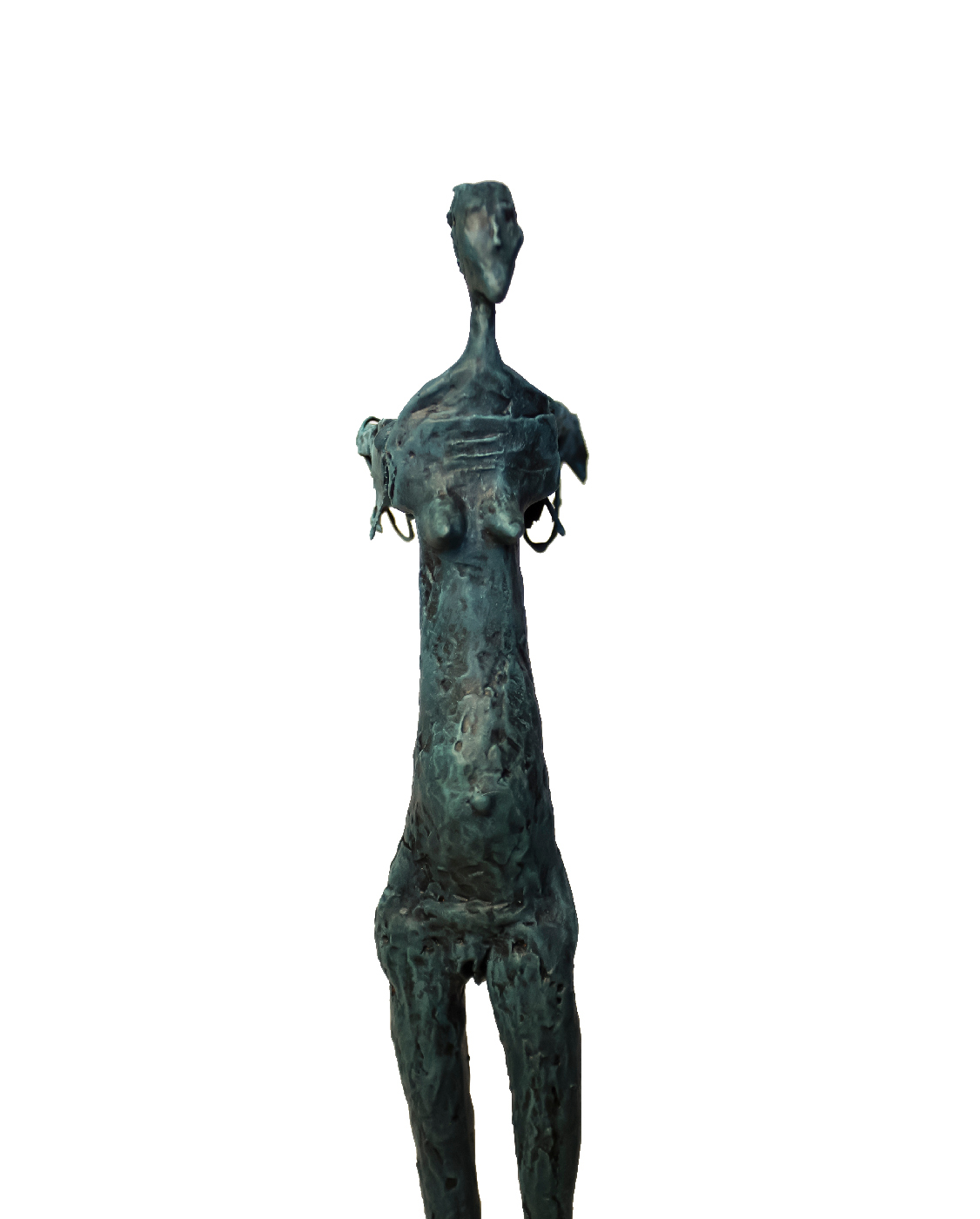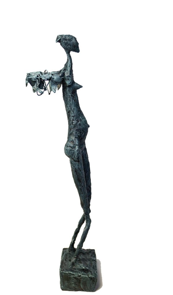 Silhouette élancée et étirée, la texture rugueuse de la surface attire l’attention, révélant la maîtrise artisanale et la profondeur émotionnelle de l’œuvre. La posture de la figure communique une tension dynamique, suscitant un sentiment de mouvement interrompu. Les longues lignes verticales et les courbes accentuées amplifient cette sensation d’élan, capturant un moment suspendu dans le temps. Un aspect unique de cette sculpture réside dans les détails raffinés au sommet de la figure, où l’artiste a intégré des éléments complexes qui contrastent avec la simplicité du reste de la forme. Ces ajouts intrigants, minutieusement travaillés, rendent l’œuvre à la fois mystique et énigmatique, incitant le spectateur à une contemplation prolongée.