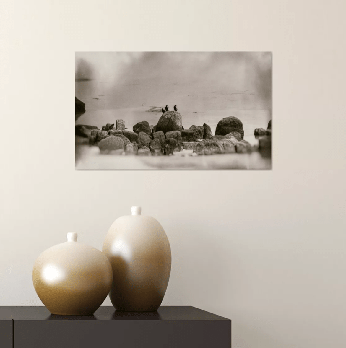 Photographie, 45 x 27 cm. Paysage menhir brouillard Bretagne, noir et blanc.
