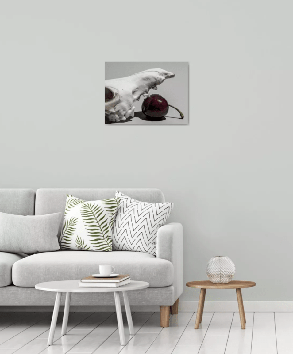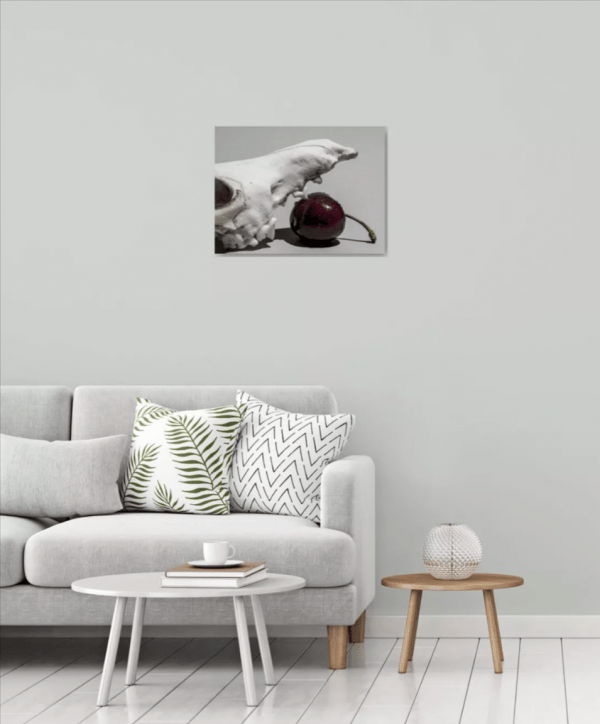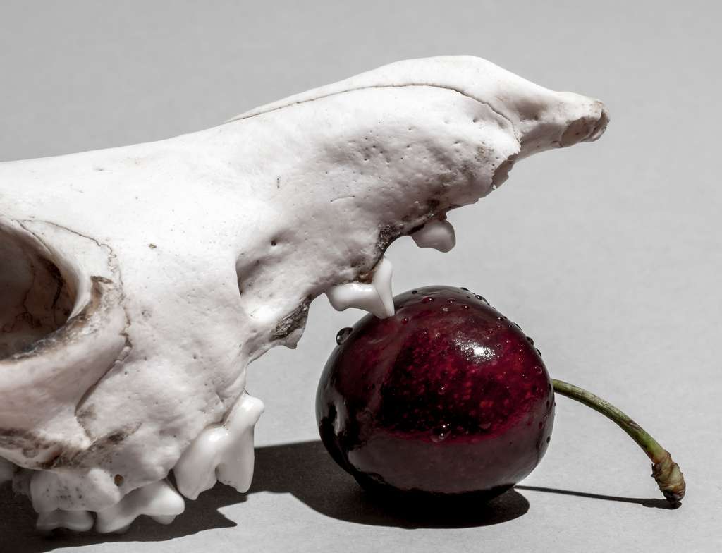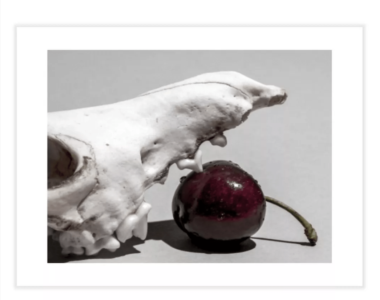Photographie couleur, 60 x 45 cm . Numérotée et signée. Nature morte au crâne et cerise.