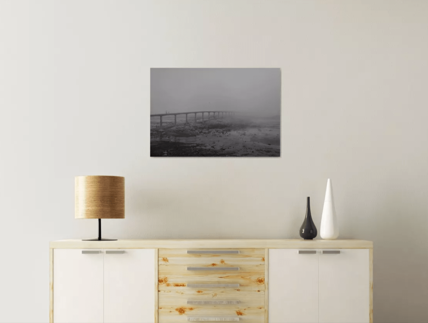 Photographie, 73 x 50 cm. Paysage pont brouillard Bretagne, noir et blanc.