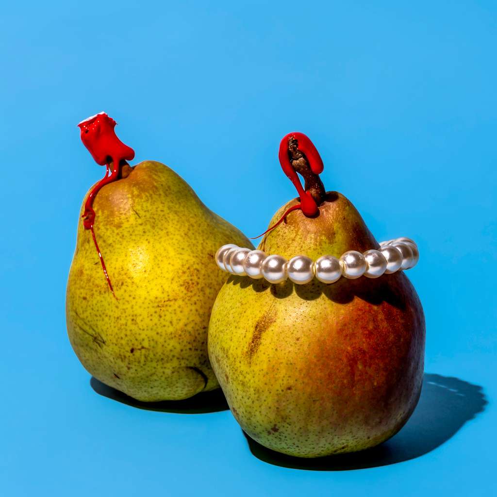 Photographie couleur, 50 x 50 cm . Pop art nature morte . Numérotée et signée. De jolies poires.