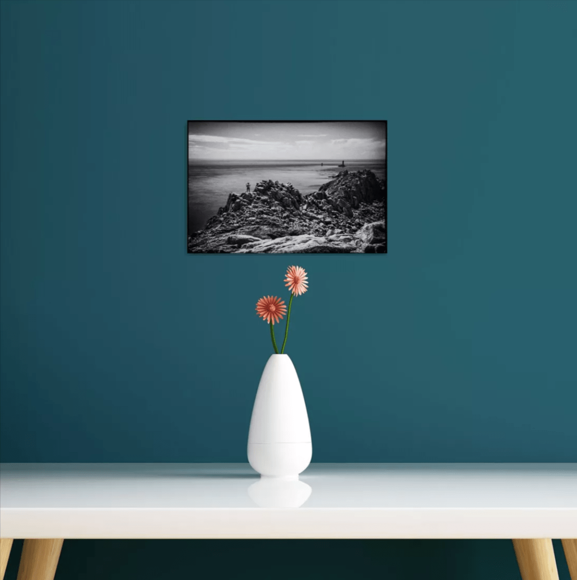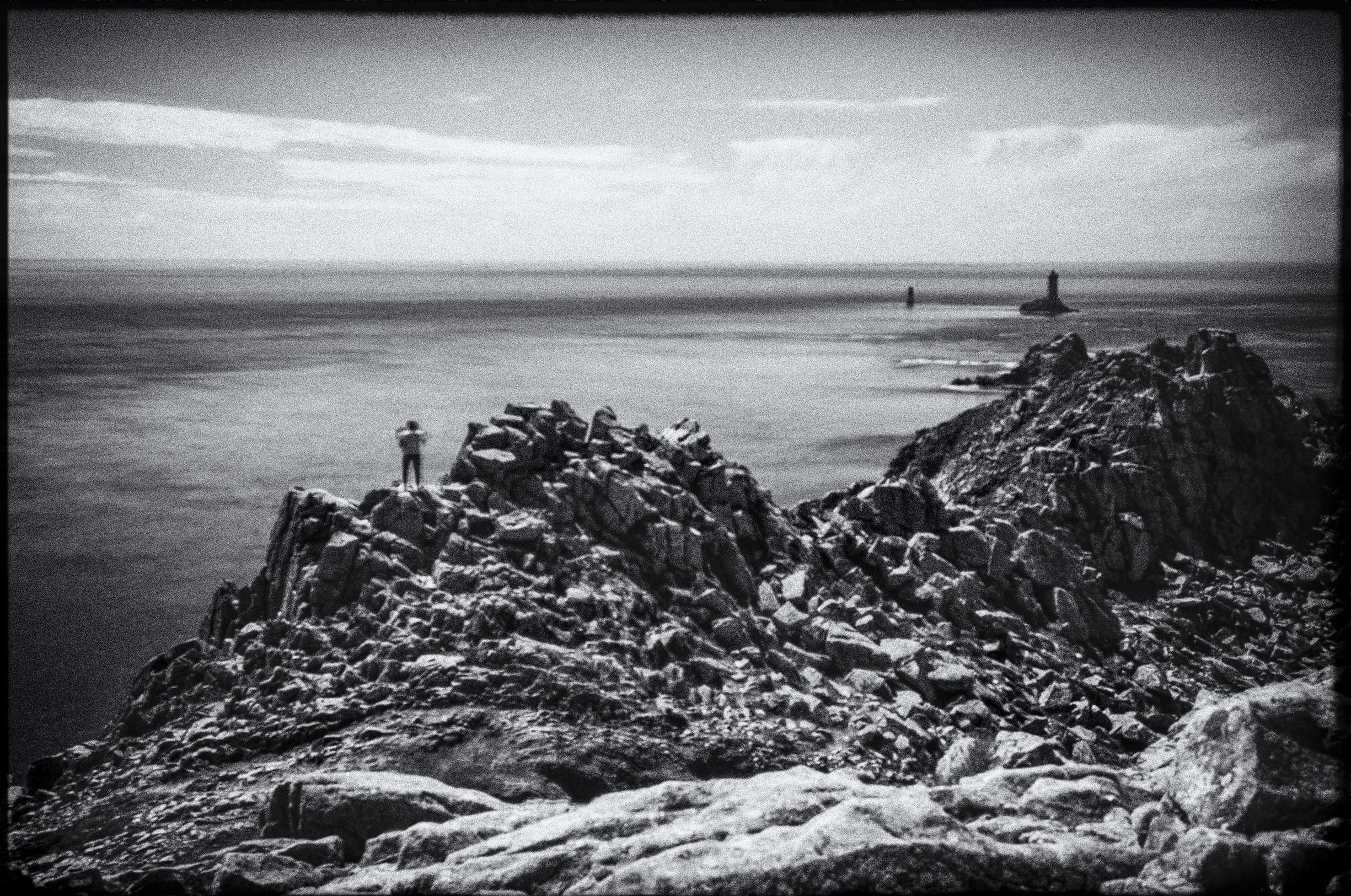 Cette œuvre en noir et blanc capture un paysage côtier empreint d’une sobriété dramatique et d’une sérénité austère. Le photographe a magistralement utilisé le contraste des nuances de gris pour souligner les détails des rochers escarpés qui dominent la scène au premier plan. La composition met en évidence une figure humaine isolée, perchée sur les rochers, symbolisant peut-être la confrontation de l’homme face à l’immensité et à la splendeur brute de la nature. A l’horizon, la mer s’étend à perte de vue, calme et infinie, ponctuée par des phares solitaires qui ajoutent une dimension de mystère et d’émerveillement à l’œuvre. Les lignes horizontales nettes de l’océan et du ciel créent une dualité frappante avec la rugosité chaotique des rochers, accentuant le contraste entre les éléments naturels. L’artiste a su capter non seulement la beauté naturelle de cette scène, mais aussi une profondeur émotionnelle et contemplative. L’absence de couleurs renforce cette atmosphère contemplative, permettant aux observateurs d’apprécier et d’interpréter les formes et la lumière dans leur état le plus pur. Cette œuvre est un témoignage exceptionnel de la puissance visuelle de la photographie monochrome, de la maîtrise de la composition et de la capacité unique de l’artiste à évoquer des sentiments profonds à travers une esthétique minimaliste.