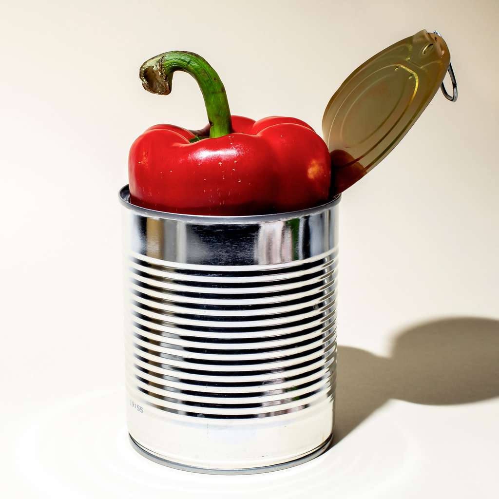 Un poivron essayant de s’échapper du confinement d’une boîte de conserve ! Sur papier Hahnemühle german etching 310G. Contrecollé sur Dibond et cadre flottant en aluminium. (autres tailles supports et encadrements possibles, nous contacter)
