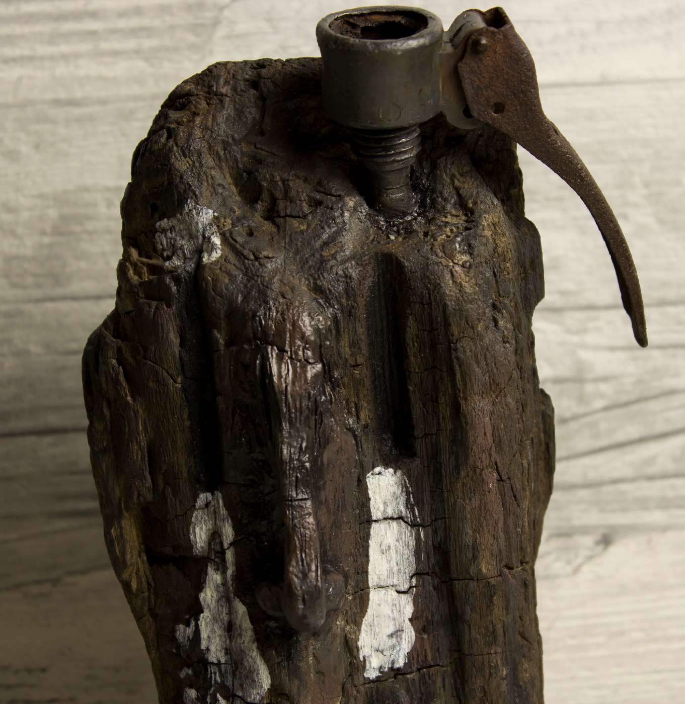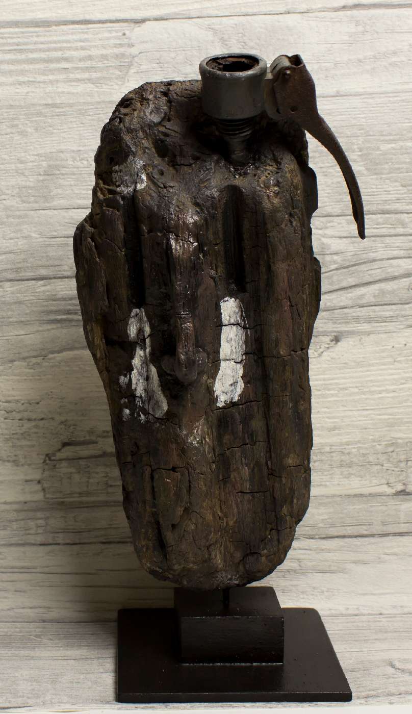 Portrait surréaliste et imaginaire d’un kamikaze. En bois flotté, argile et véritable levier de grenade ( inoffensif )