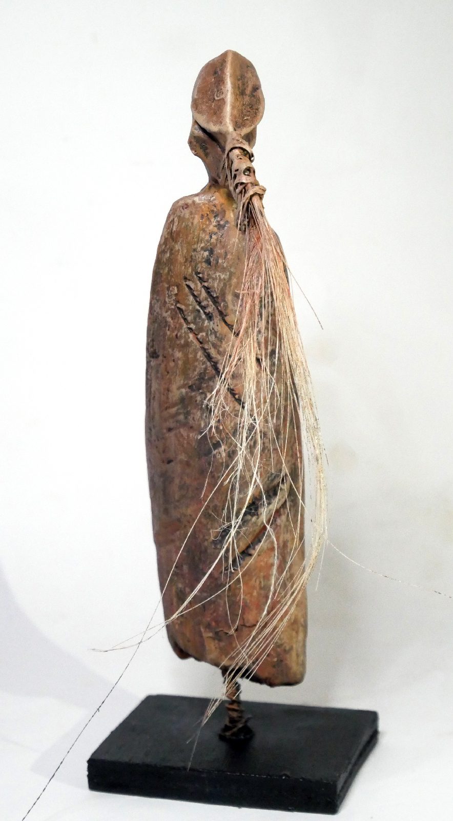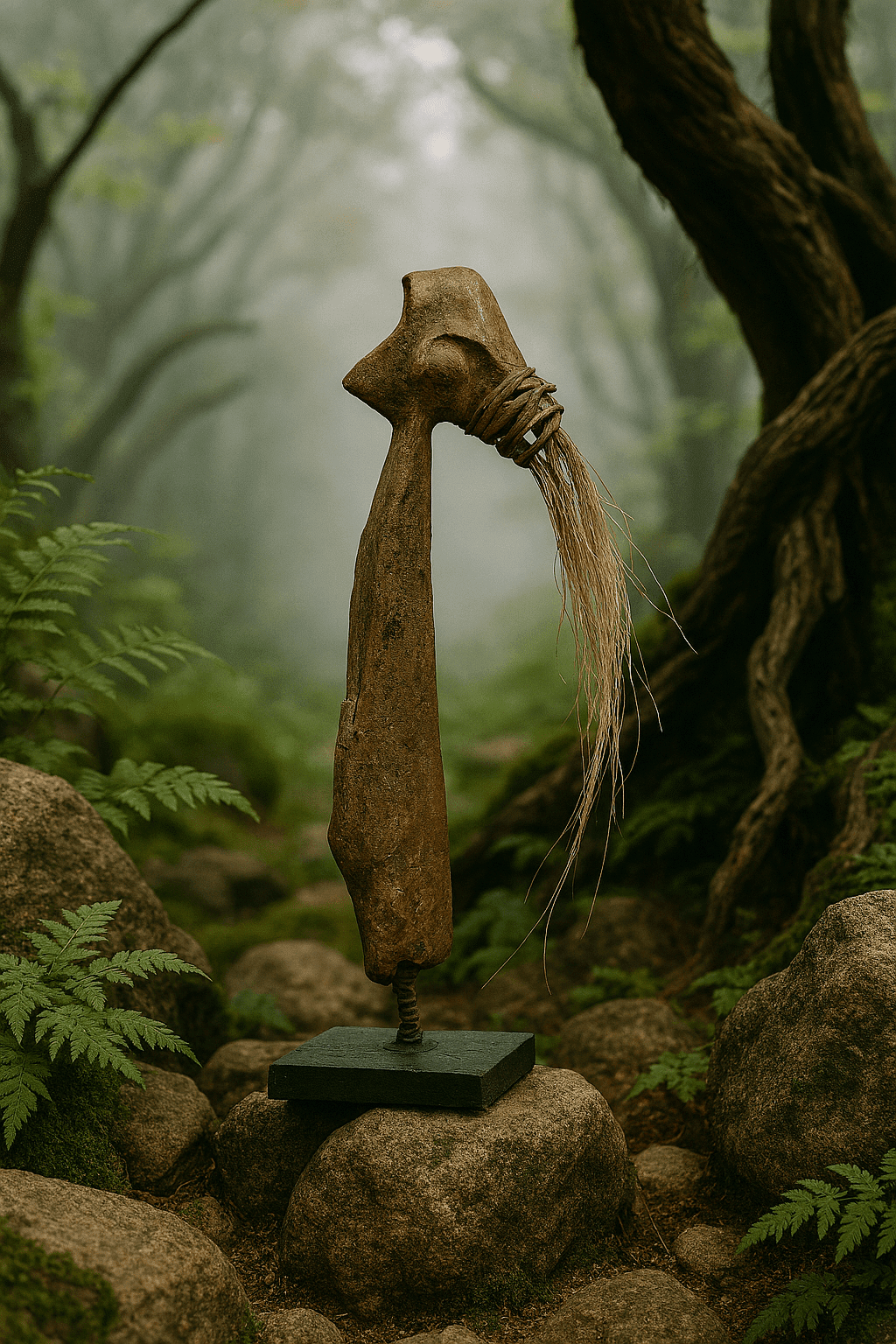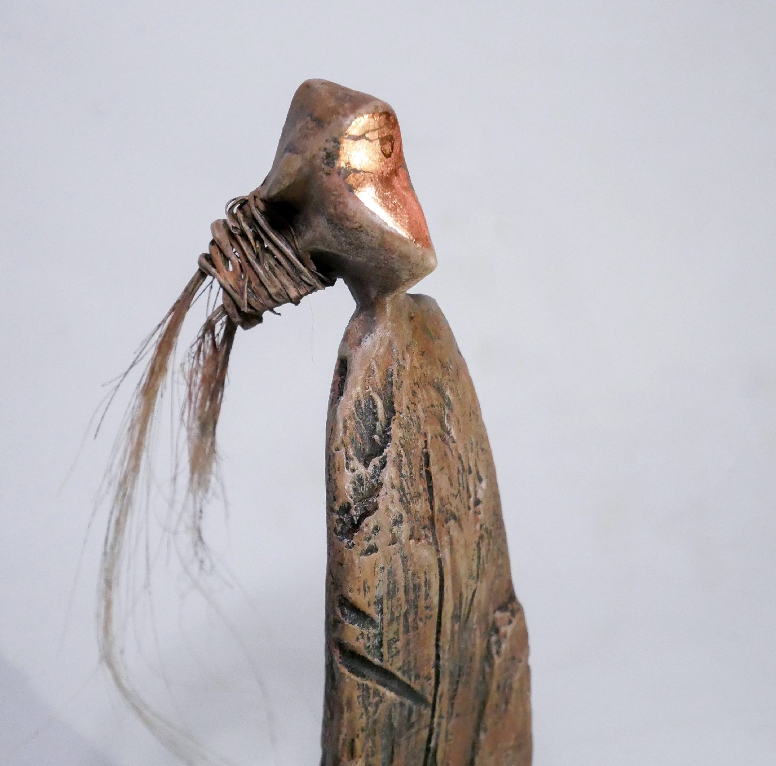 Figure totémique en bois flotté, crin de cheval, feuille de bronze et argile (Technique mixte). Le bois flotté est récolté sur les plages méditerranéennes donc traité naturellement par le sel. Oeuvre protégée par un vernis mat. Dans cette œuvre l’argile et la chaleur du bois, offre une présence organique et authentique. Les textures sont une ode à la nature, tandis que la forme s’élance, évoquant la croissance et la persévérance. Elle apportera à votre espace une énergie de force tranquille et une touche de mystère intemporel. Collectionnez – les 🙂