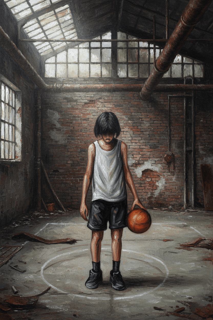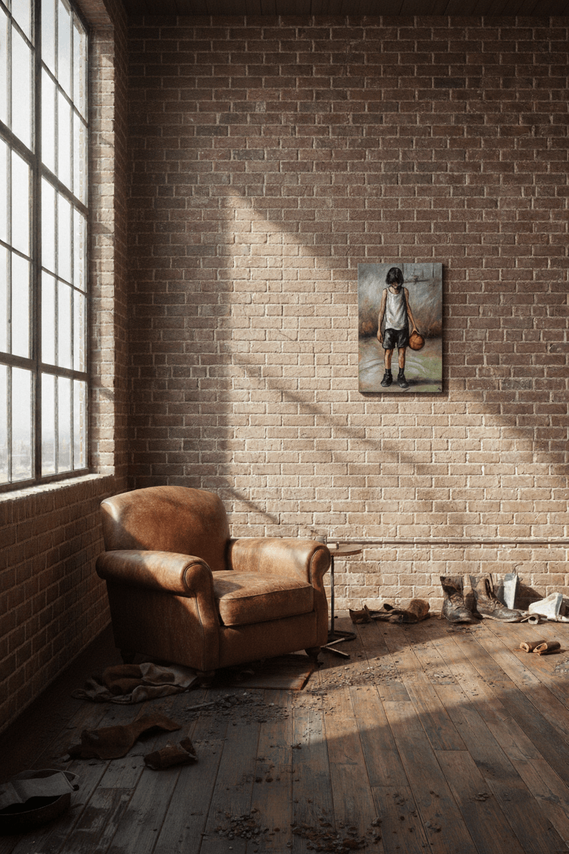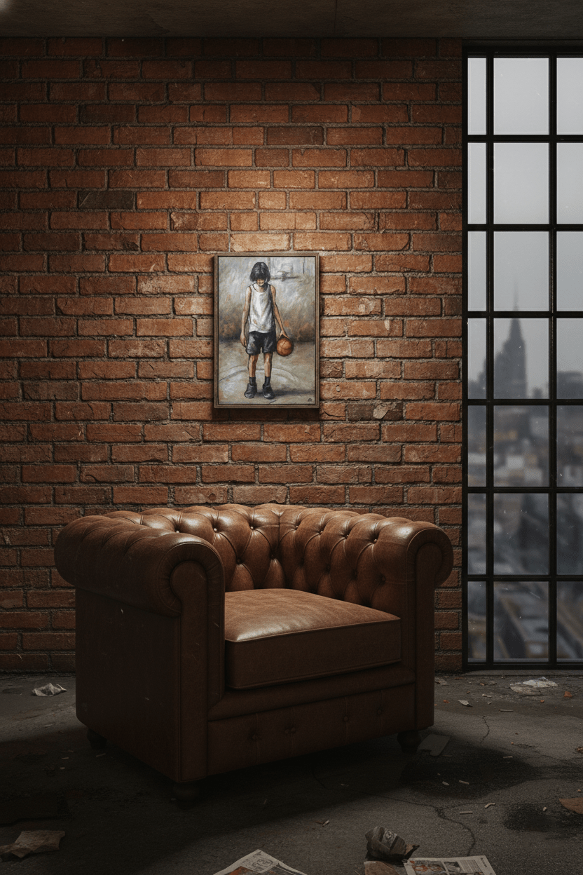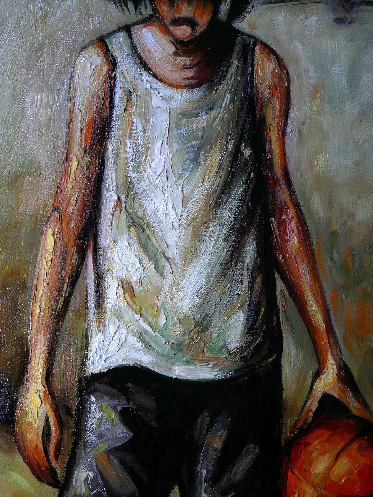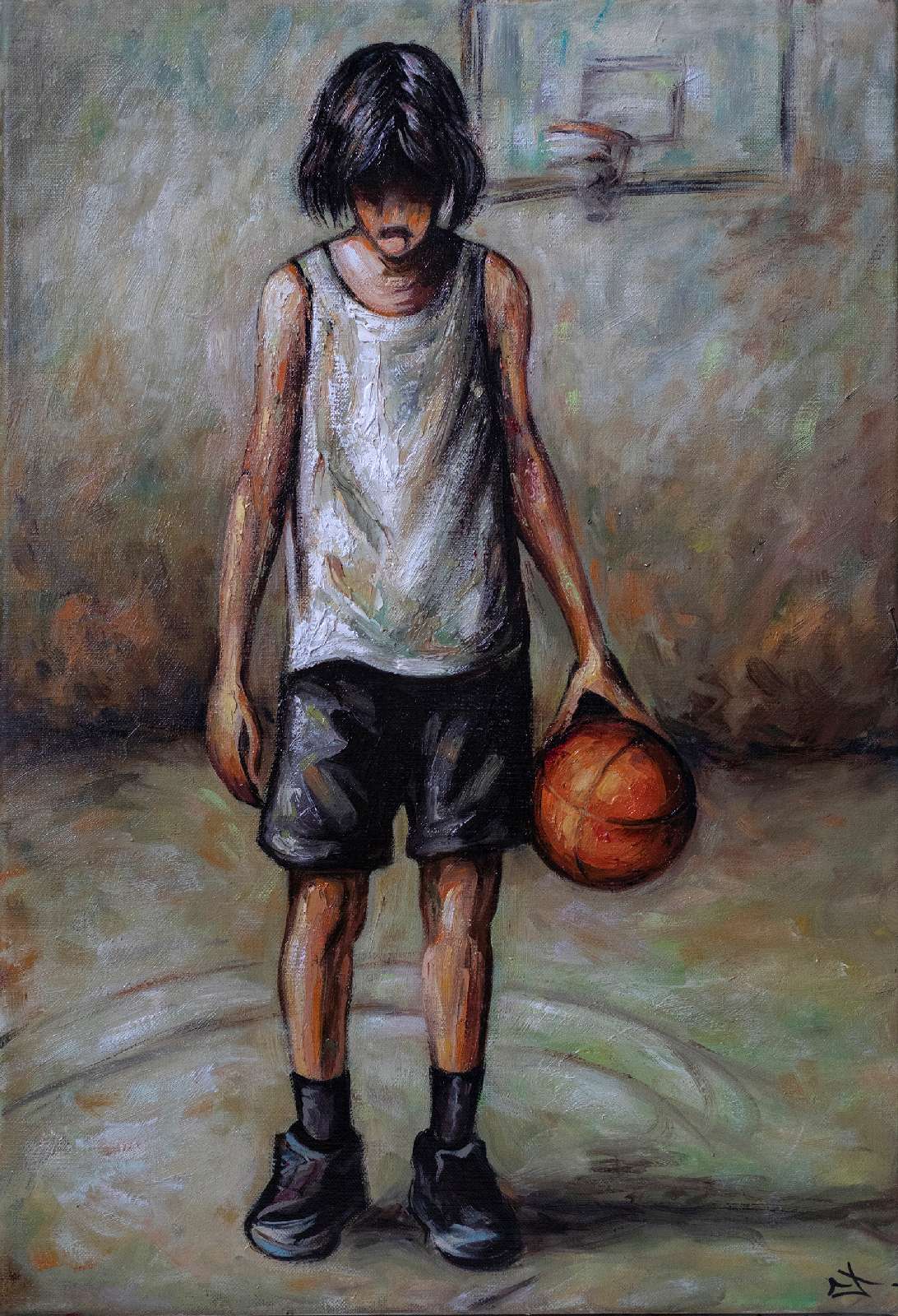 Dans une atmosphère chargée d’émotion brute, cette toile capture un instant suspendu sur un terrain de basket déserté. Un adolescent, silhouette solitaire en posture introspective, tient un ballon contre sa hanche. Le regard baissé, les cheveux tombant sur le visage, il semble absorbé par ses pensées, entre mélancolie et détermination. Le fond, texturé et sobre, évoque les murs usés d’un gymnase, renforçant le sentiment de solitude et de quête identitaire.