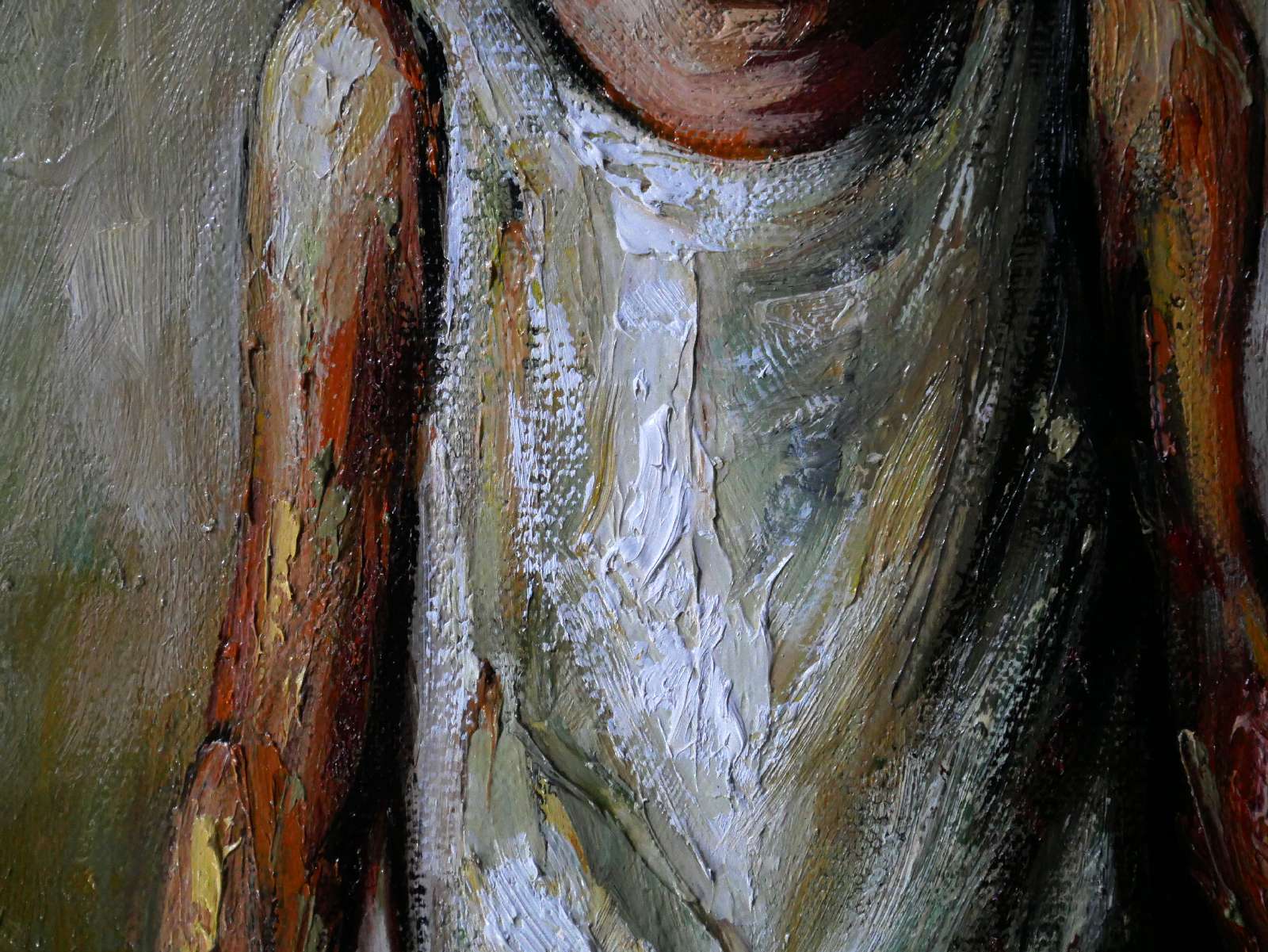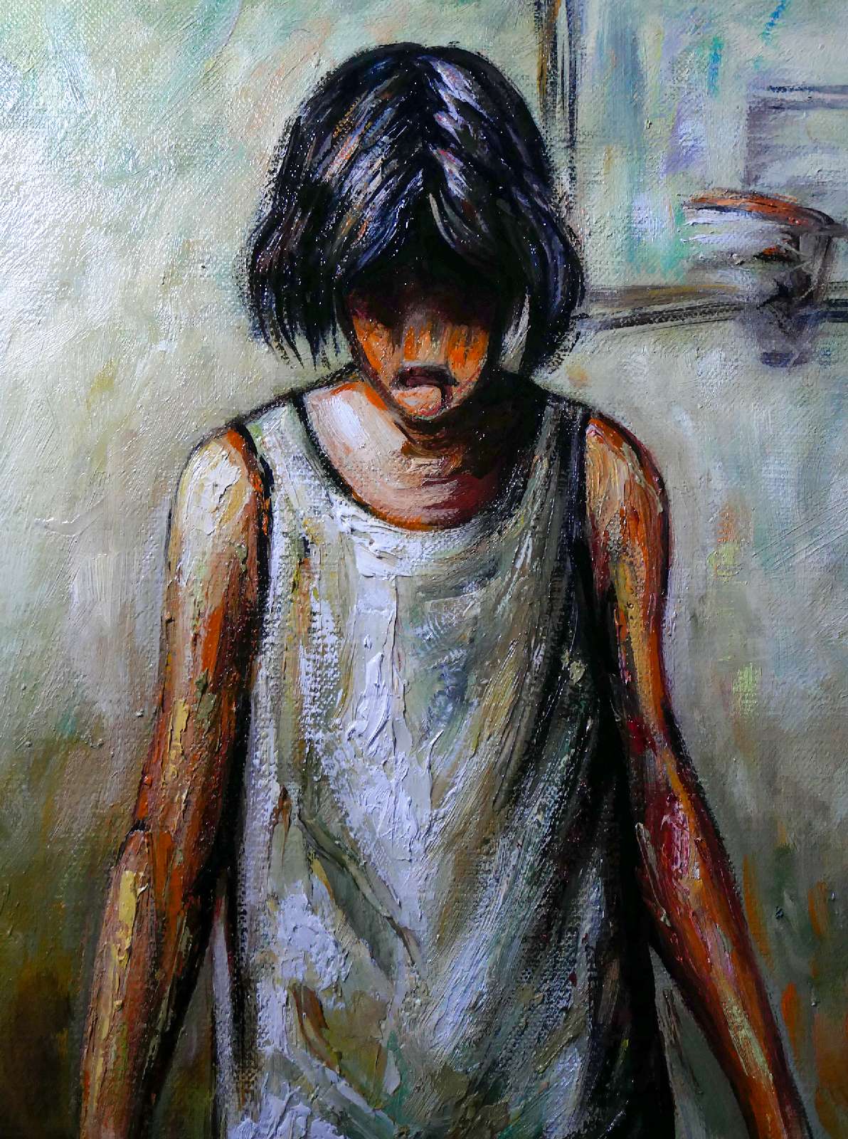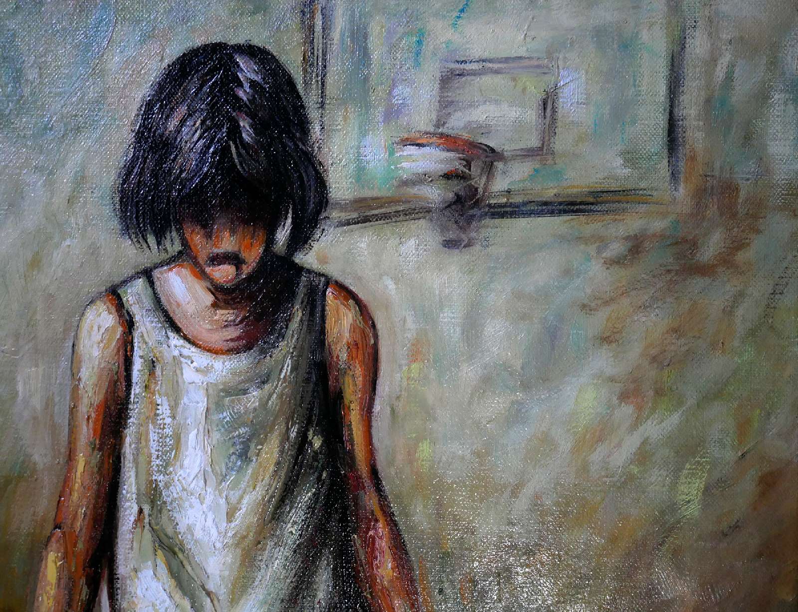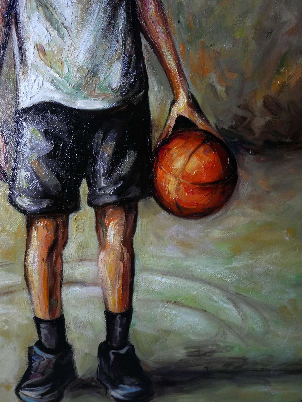 Dans une atmosphère chargée d’émotion brute, cette toile capture un instant suspendu sur un terrain de basket déserté. Un adolescent, silhouette solitaire en posture introspective, tient un ballon contre sa hanche. Le regard baissé, les cheveux tombant sur le visage, il semble absorbé par ses pensées, entre mélancolie et détermination. Le fond, texturé et sobre, évoque les murs usés d’un gymnase, renforçant le sentiment de solitude et de quête identitaire.