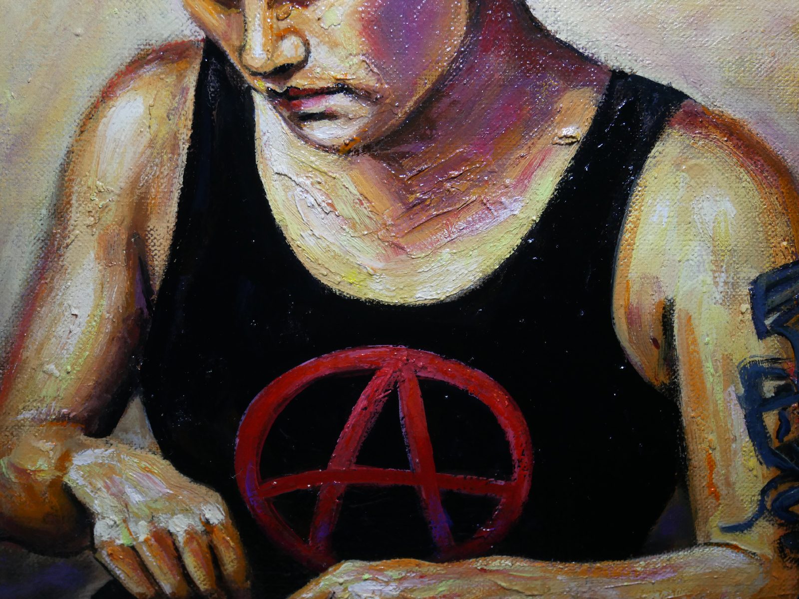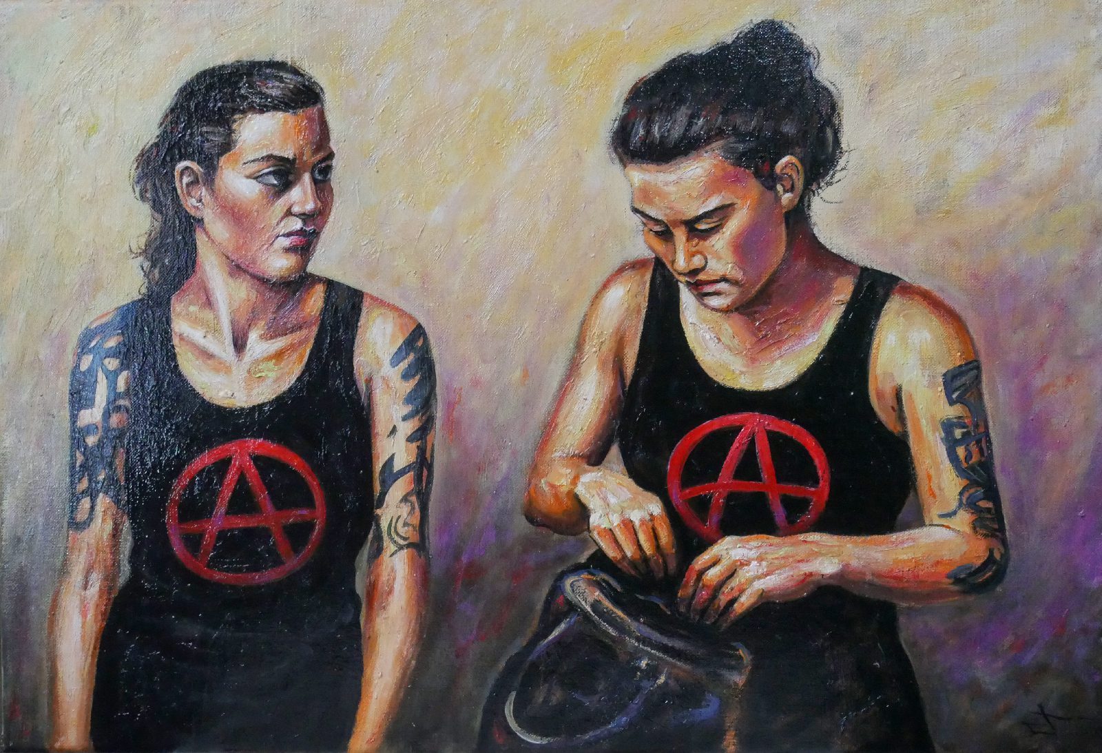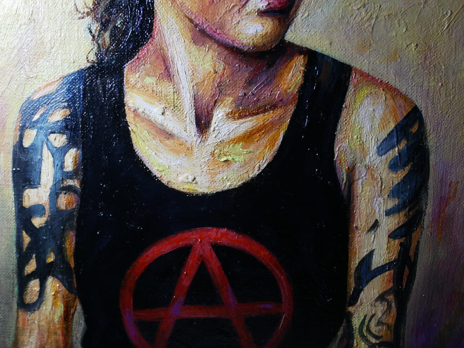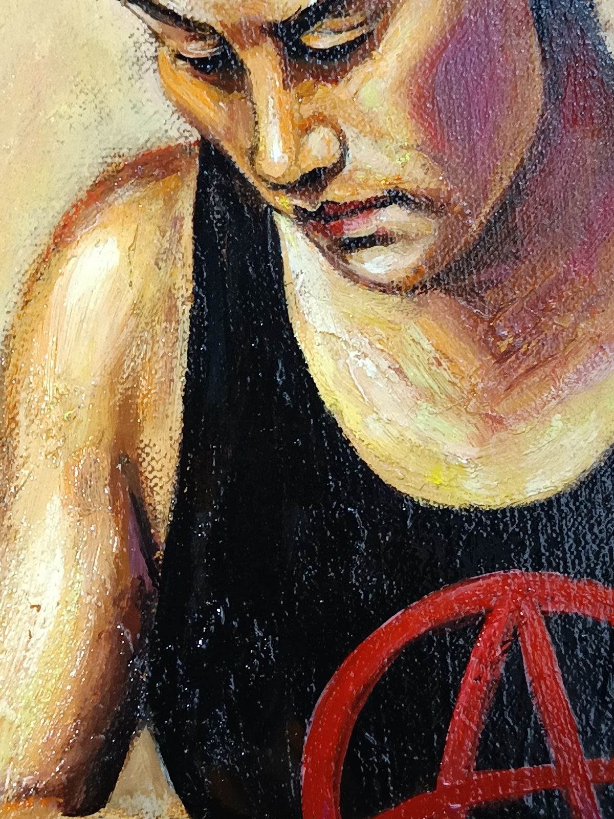 Ici, pas de paillettes, mais la réalité d’une jeunesse qui porte ses convictions à même la peau. Le symbole A, le regard lourd, et cette lumière presque théâtrale viennent capturer l’essence de la rébellion.