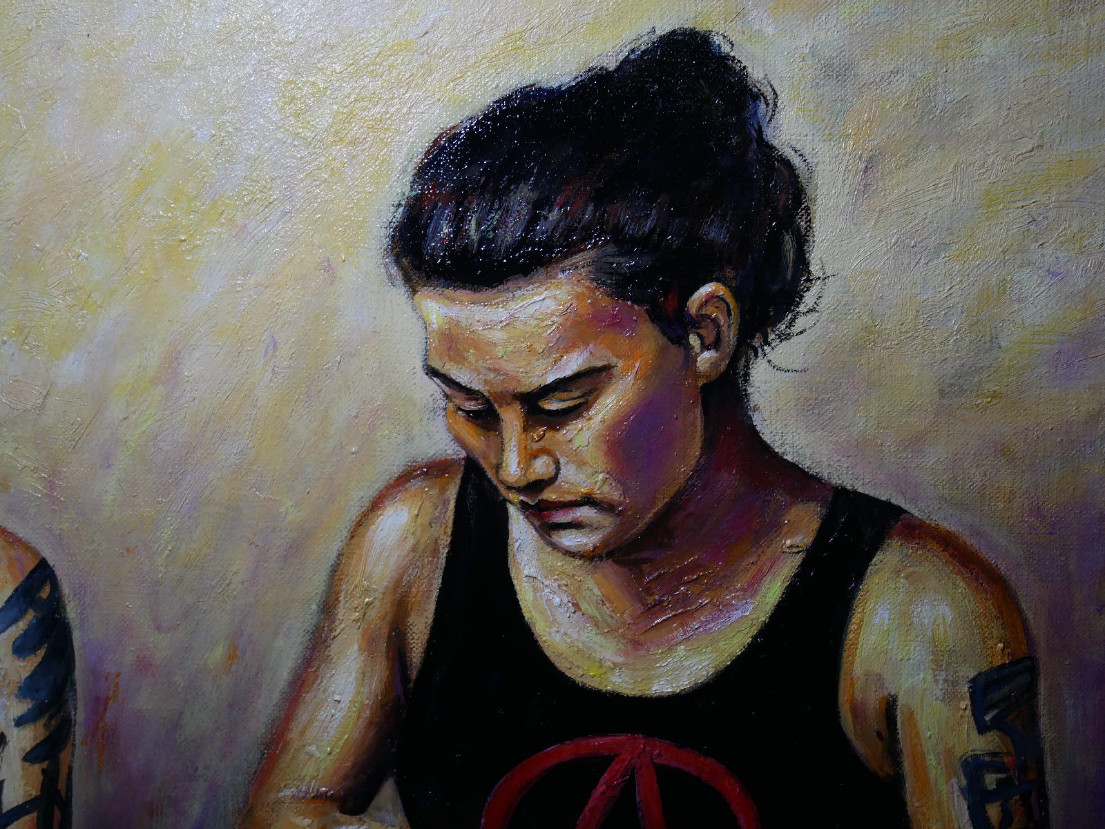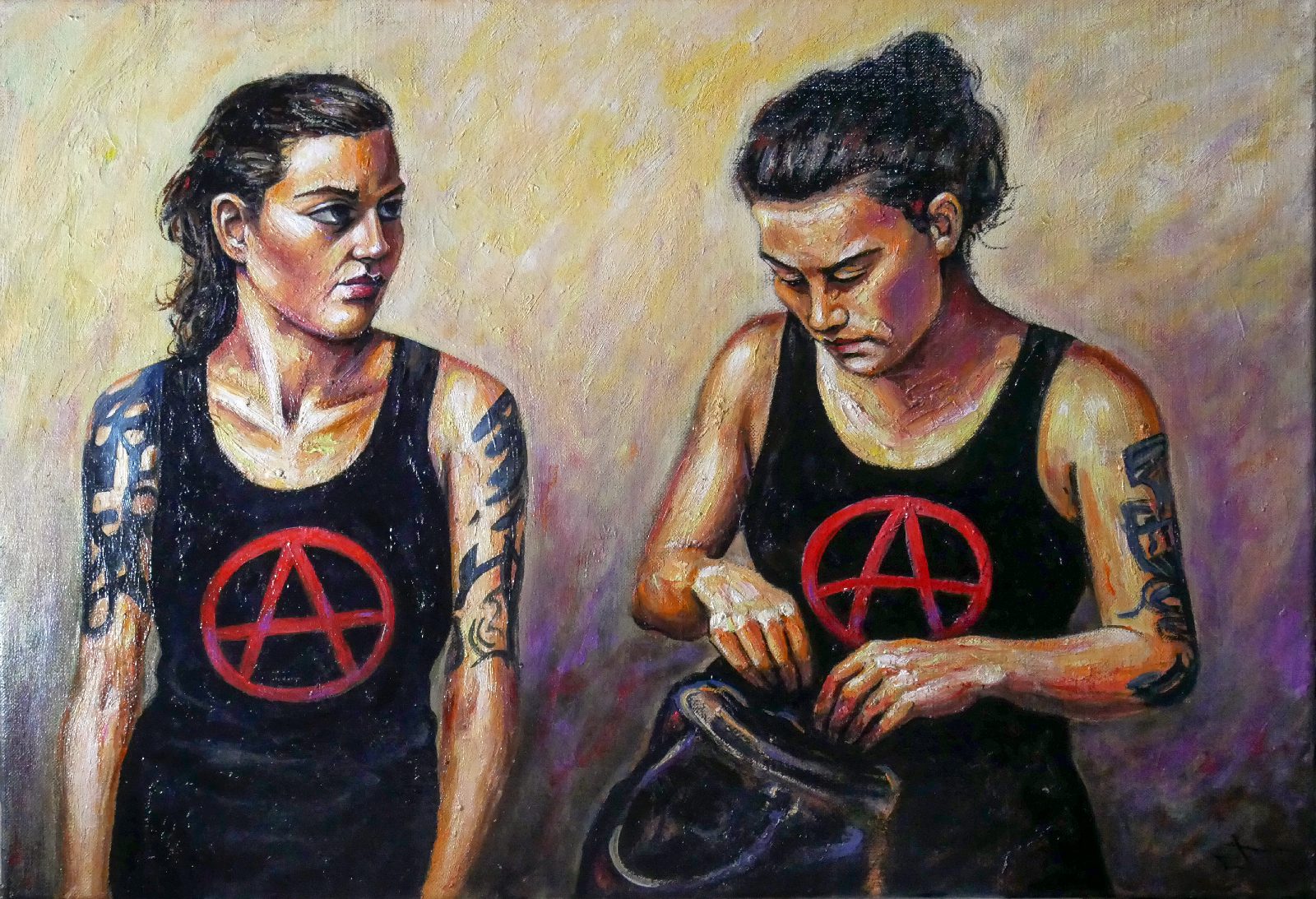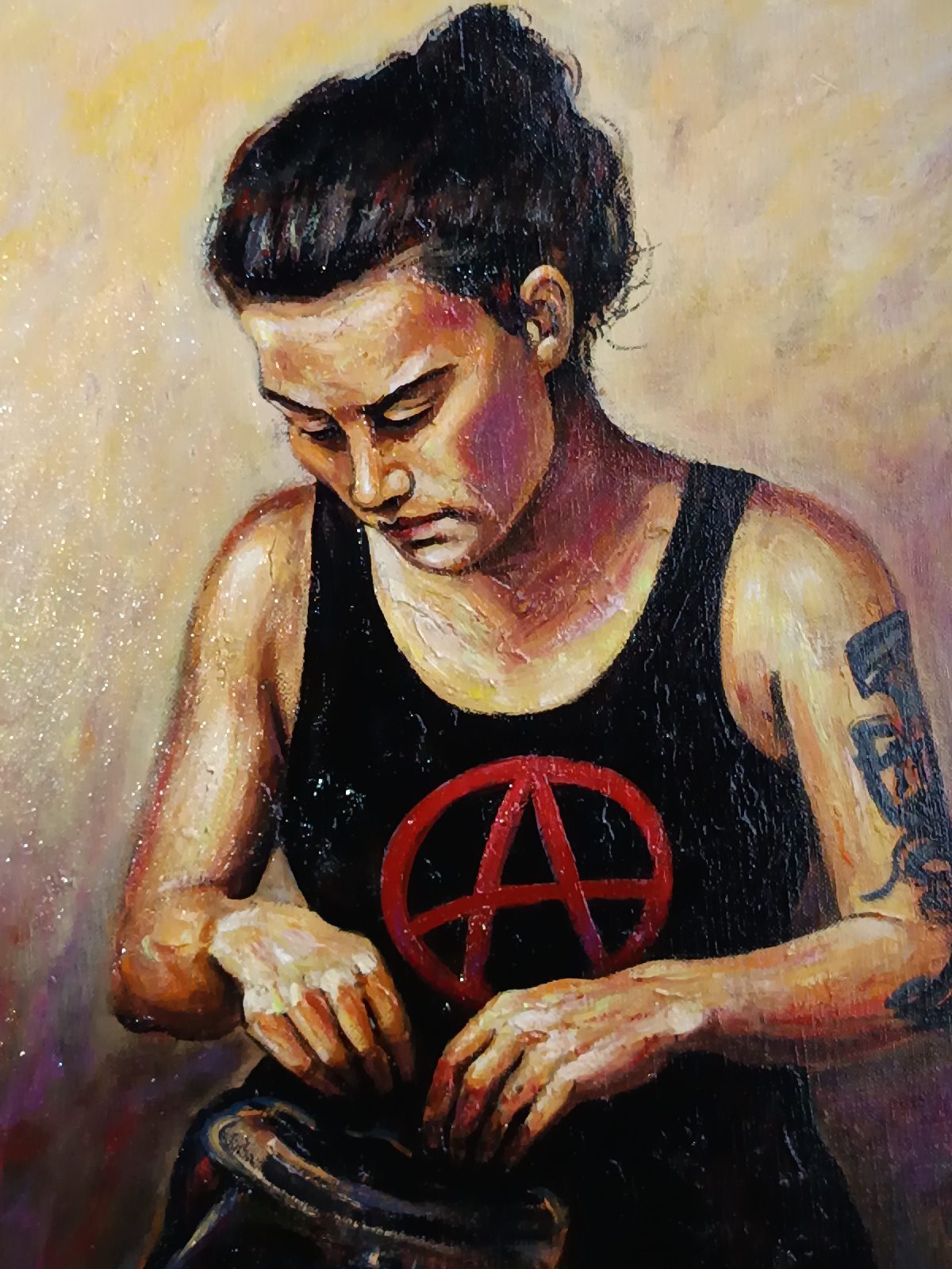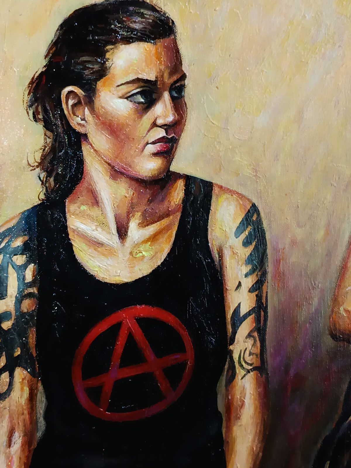 Ici, pas de paillettes, mais la réalité d’une jeunesse qui porte ses convictions à même la peau. Le symbole A, le regard lourd, et cette lumière presque théâtrale viennent capturer l’essence de la rébellion.