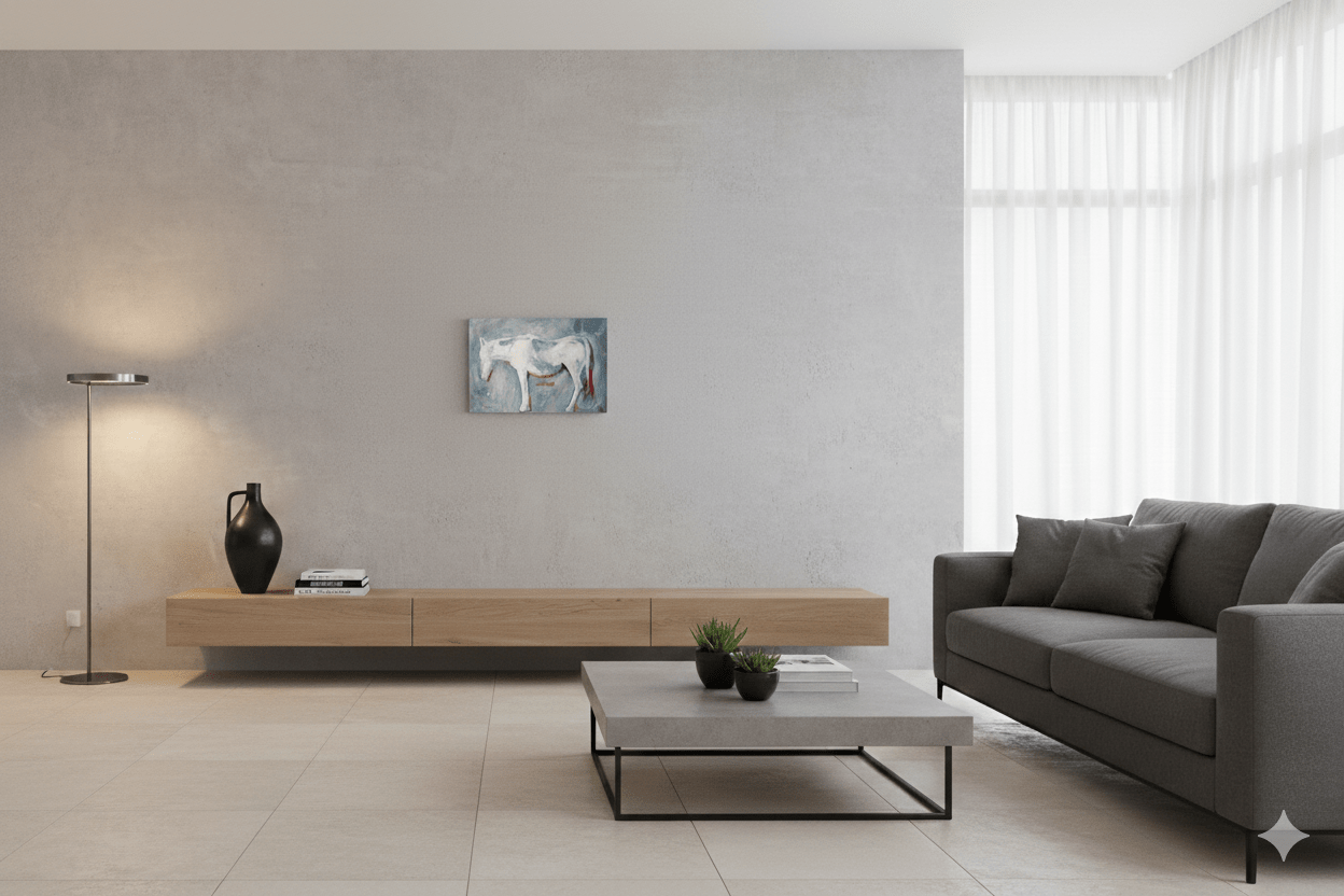 Ce tableau représente un cheval traité à grands coups de pinceau expressifs. La silhouette blanche du cheval se détache nettement sur un fond gris homogène, créant un contraste puissant et dramatique. Les coups de pinceau rouges tranchants, stratégiquement placés sur les membres et la queue de l’animal, ajoutent une touche de dynamisme à l’œuvre, suggérant à la fois la vitalité et une certaine vulnérabilité de la créature. La simplicité apparente de la palette de couleurs – principalement des nuances de gris et de blanc, rehaussées de rouge – permet de concentrer l’attention sur la forme et l’attitude du cheval. La posture de l’animal, tête basse, pourrait évoquer une introspection ou une résignation, ajoutant une dimension émotionnelle à la composition. Ce tableau fait preuve d’une maîtrise impressionnante dans l’utilisation du geste pictural pour exprimer des émotions complexes. L’absence de détails fins et l’utilisation de larges traits donnent à l’œuvre une qualité presque abstraite, tout en restant immédiatement reconnaissable et accessible. On devine dans cette simplicité calculée une profonde compréhension de la forme équine et une capacité à susciter l’émotion à travers des moyens picturaux épurés. En somme, ce tableau est une œuvre captivante qui se distingue par son évocation minimaliste mais puissante d’un cheval, ses contrastes de couleurs audacieux, et son expressivité brute. Une oeuvre qui attire et retient l’œil par sa profondeur émotionnelle et sa sophistication stylistique.