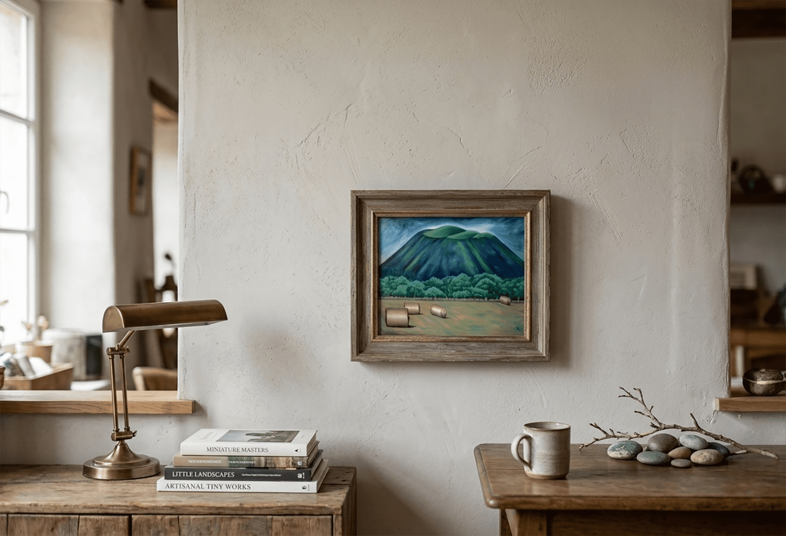 Cette huile sur toile saisissante capture la puissance brute des volcans d’Auvergne. Dominant la composition, le colosse endormi est traité avec des tons profonds et texturés de vert et de bleu, sous un ciel dramatique et changeant. Au premier plan, un champ moissonné aux teintes ocre et dorées accueille quatre balles de foin rondes, apportant une touche de sérénité rurale face à la majesté sauvage de la montagne. Entre le volcan et le champ, une lisière de végétation dense et variée forme un écrin naturel éclatant. Une œuvre vibrante qui invite à la contemplation de la grandeur de la nature auvergnate.